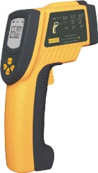 紅外測溫儀測量物體表面溫度,其光學系統(tǒng)匯聚被測物體的紅外輻射能量,匯聚到的能量聚焦在光電探測器上并轉變?yōu)橄鄳碾娦盘?,該信號經電路轉換變?yōu)樽x數顯示LCD屏幕上,本機配備的激光燈能有效的對準被測物體及提高測量精度。