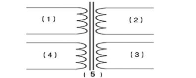本柜機(jī)可對(duì)變壓器的任一繞阻或繞阻與繞阻或繞阻與鐵芯之間的多種多步的測(cè)試;即可測(cè)試任一繞阻的電感,匝間或直流低電阻,各繞阻之間和各繞阻和鐵芯之間的絕緣耐壓,一次性完成所有測(cè)試,方便準(zhǔn)確高效. 圖中所示①②③④均為變壓器的繞阻,⑤為變壓器的鐵芯。如可設(shè)置為測(cè)試①的匝間,電感,直流低電阻, ①和②的耐壓, ①和⑤的絕緣, ②和④的絕緣,或有其它的多種任意組合. 所配的氣動(dòng)夾具可以方便的對(duì)待測(cè)器件的各個(gè)端子進(jìn)行連接。