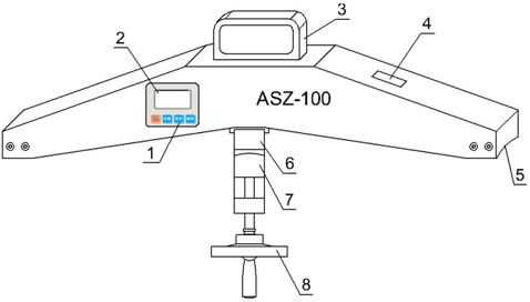 1、功能按鍵 2、液晶顯示屏 3、手柄 4、Rs232九孔插座與電源