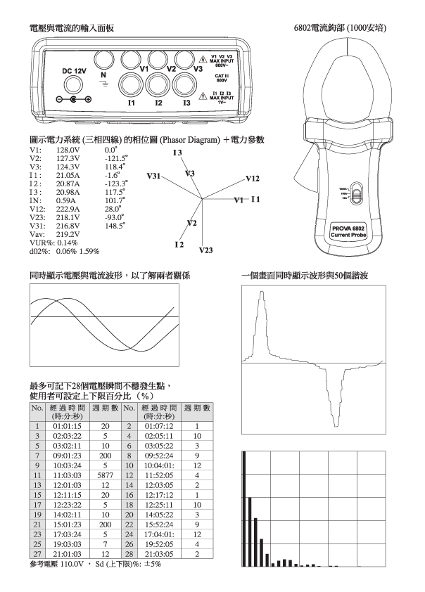 - 關(guān)鍵參數(shù):PROVA-6830+6802 電力品質(zhì)分析.電流測(cè)量從 0.1mA 到 3000A , 可測(cè)小型IT待機(jī)耗電量到大型電力系統(tǒng)的最大需求.一個(gè)畫面同時(shí)顯示35個(gè)三相四線的電力參數(shù).可設(shè)定CT比(1 to 600)與PT比(1 to 3000).同時(shí)顯示電壓與電流波形,以了解兩者關(guān)系. 部直徑(Model 3007 為軟性感測(cè)器直徑)∶ -Model 6801 30mm(approx) -Model 6802 55mm