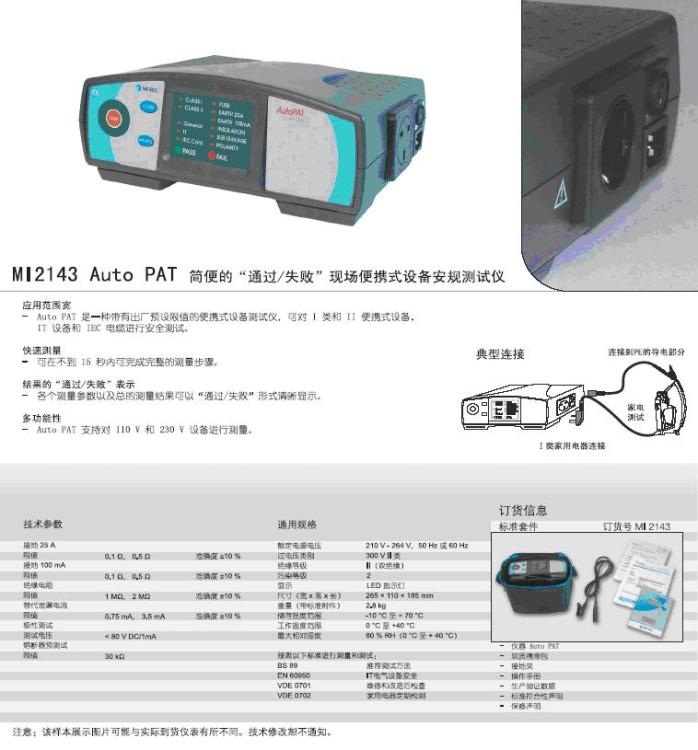 - 關(guān)鍵參數(shù):MI2143現(xiàn)場便攜式設(shè)備安規(guī)測試儀,應(yīng)用范圍寬,可對(duì)I類和II便攜式設(shè)備、IT設(shè)備和IEC電纜進(jìn)行安全測試。可在不到 15 秒內(nèi)可完成完整的測量步驟,各個(gè)測量參數(shù)以及總的測量結(jié)果可以“通過 / 失敗”形式清晰顯示。支持對(duì) 110 V 和 230 V 設(shè)備進(jìn)行測量。