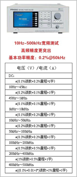 PF4000功率分析儀可解決10Hz~500kHz電信號(hào)的精確測(cè)量,采用DSP高速采樣、低失真寬帶取樣、信號(hào)實(shí)時(shí)分析、PLL鎖相環(huán)同步,線性濾波,過(guò)零濾波等國(guó)際先進(jìn)技術(shù),保證各種非周期波及高頻信號(hào)的精確測(cè)量,大屏幕液晶顯示所有測(cè)試數(shù)據(jù)與波形,無(wú)需電腦即可獨(dú)立工作。10Hz~500kHz寬頻測(cè)試,高頻精度更突出,功率基本精度為0.2%@50kHz。