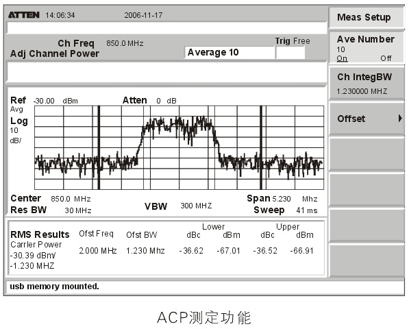 ·相鄰頻道功率(ACP)測試:是測試在使用多重頻道的移動(dòng)通信系統(tǒng)上的傳送電力對相鄰頻道所起到的影響或者與相鄰頻道之間的電力比率??梢栽谝粋€(gè)屏幕上查看所有測試值以及波形。